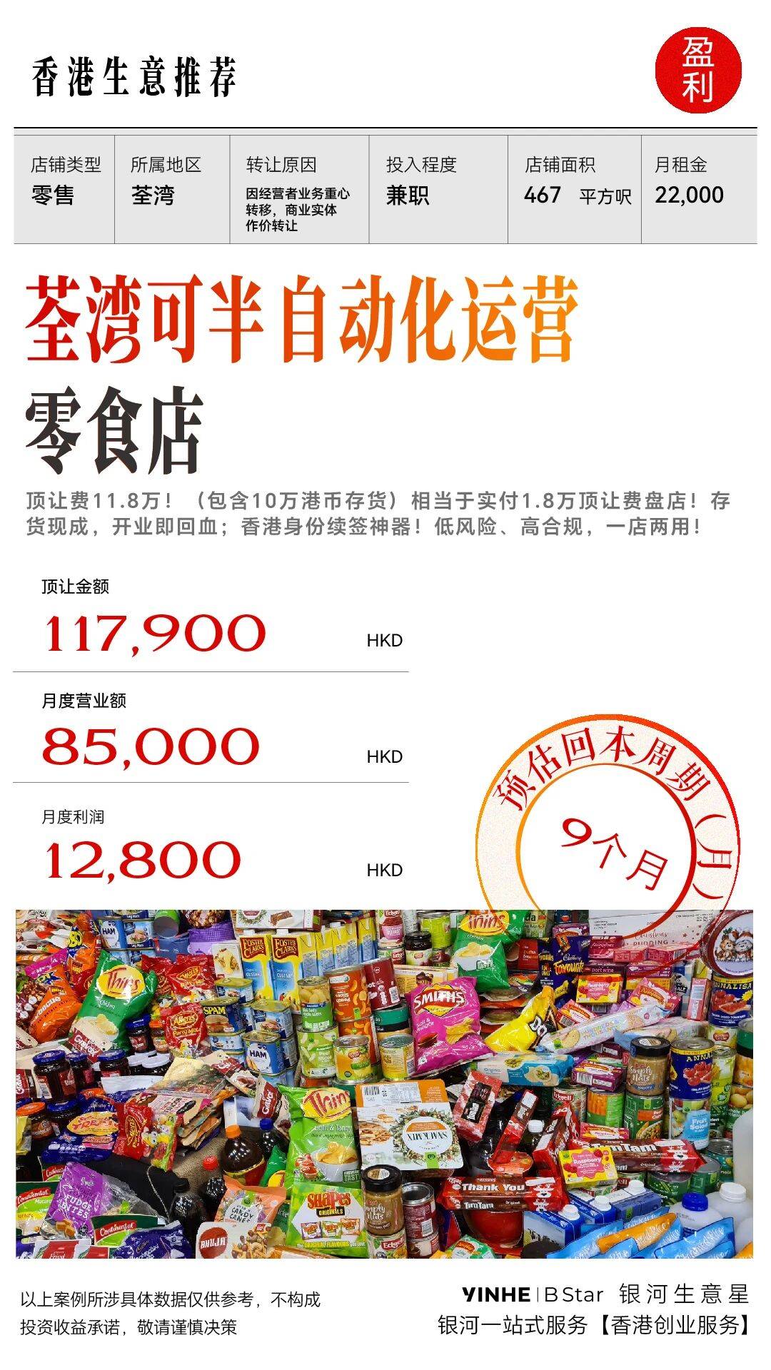 财务数据:顶让金额117900,月营业额85000万港元,月利润12800万港元(利潤已包括東主薪金),回本周期仅9个月。