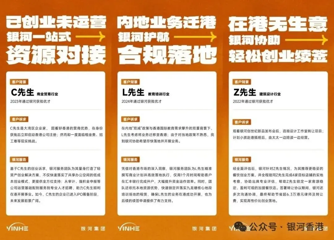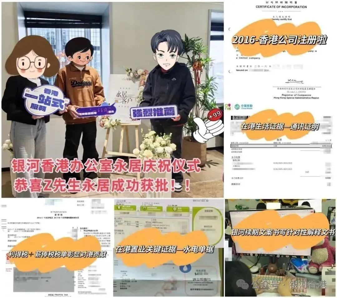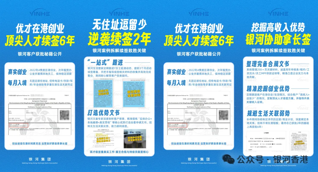 银河集团可以一站式解决香港签证办理、身份续签、公司开立、创业、居住地址、子女教育、驾照出行、税务规划等问题,为你构建真实运营+生活关联等证据链。