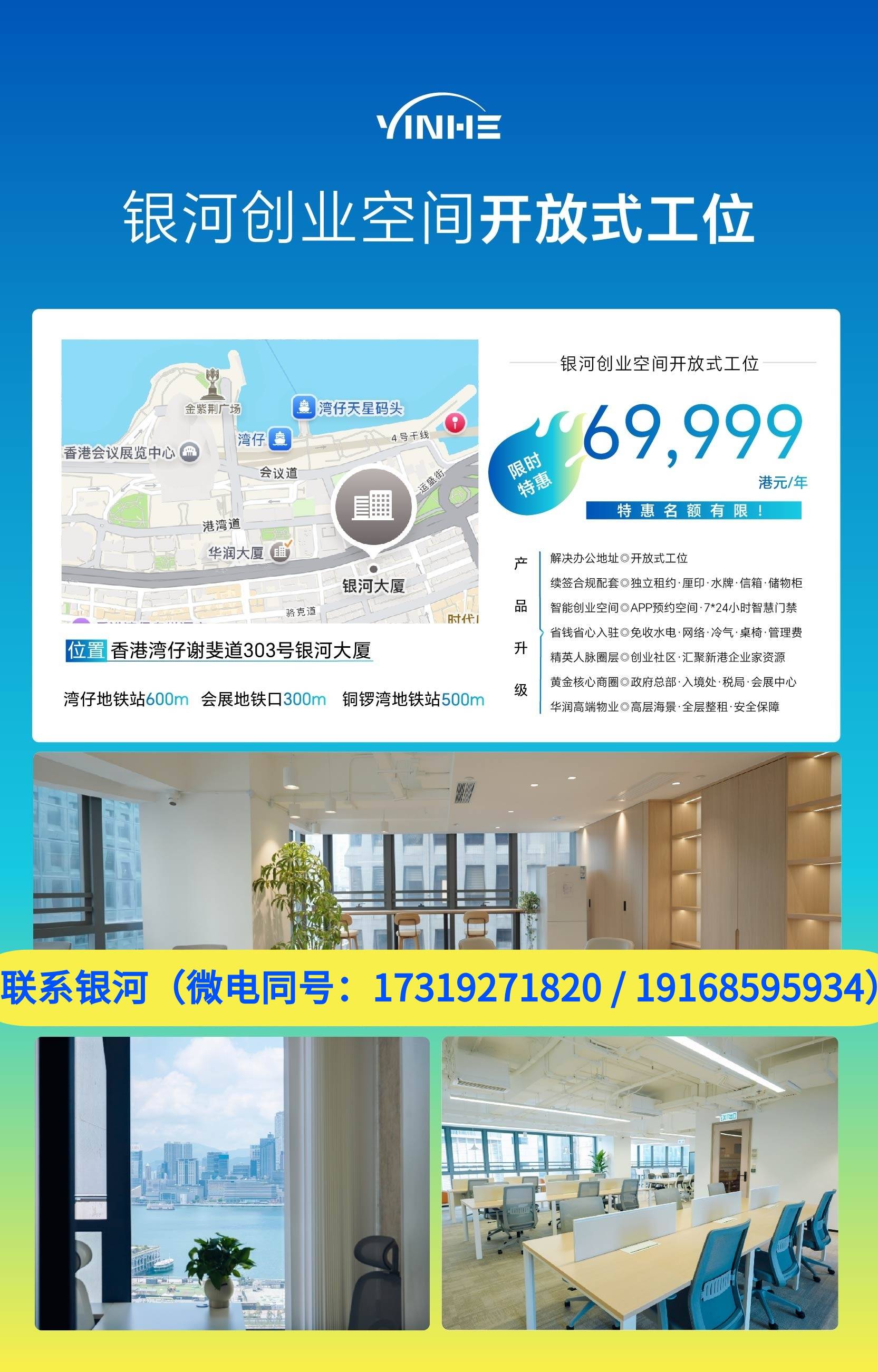 需要在香港租赁开放式工位或独立办公室的老板们,又或者想要规划后续公司商务维护及税务合规,都可以联系银河(微电:17319271820 / 19168595934)咨询详情:
