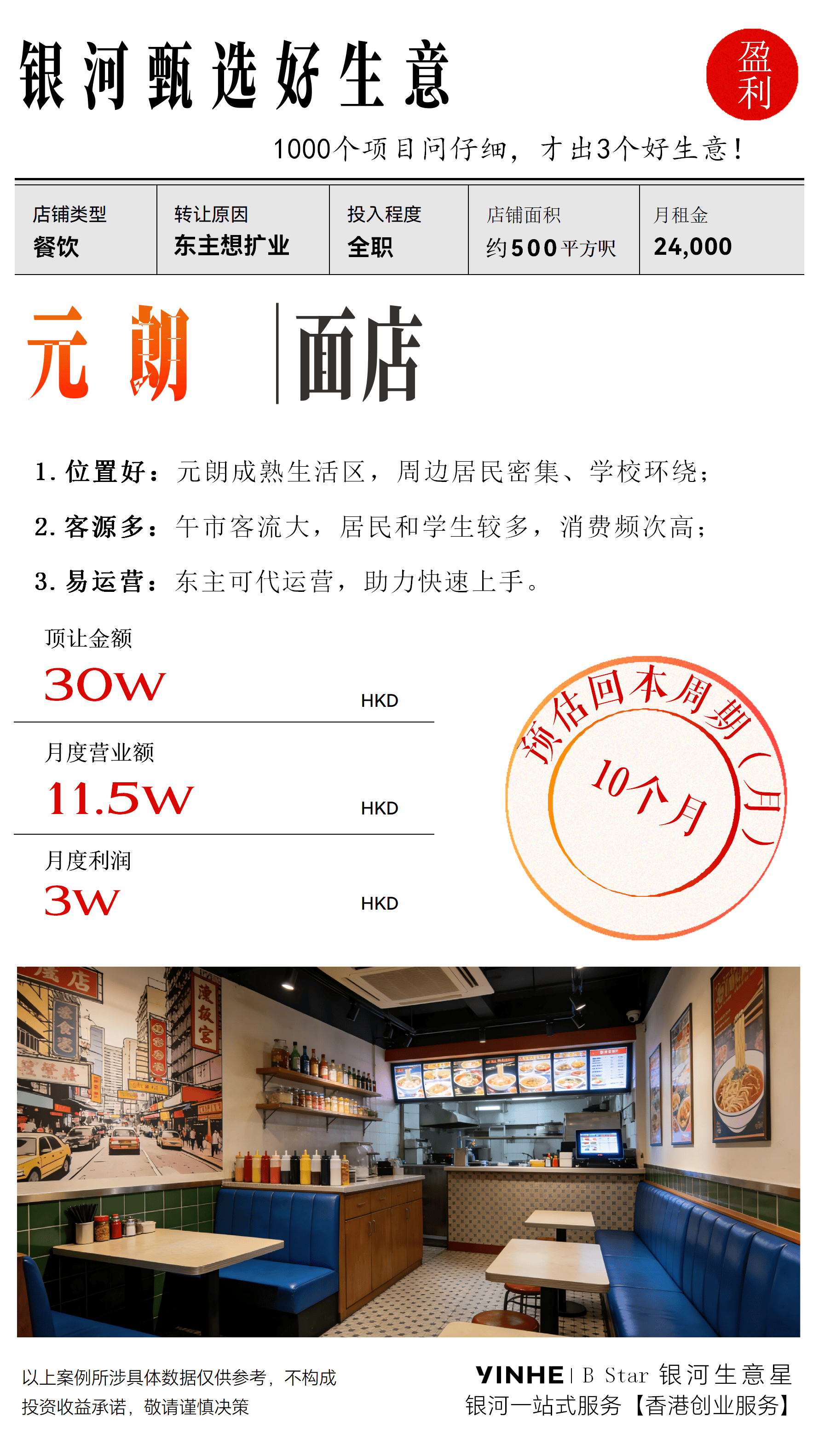 从投资角度来看,这家面店的顶让费为30万港币,月营业额可达11.5万港币,月租金为2.4万港币,月利润为3万港币,预估回本周期10个月。店铺规模适中,投资门槛相对较低。经营数据稳定,无大幅波动,商业模式成熟,投资回报路径清晰。对于想要在香港创业的投资者来说,这无疑是一个具有吸引力的选择。
