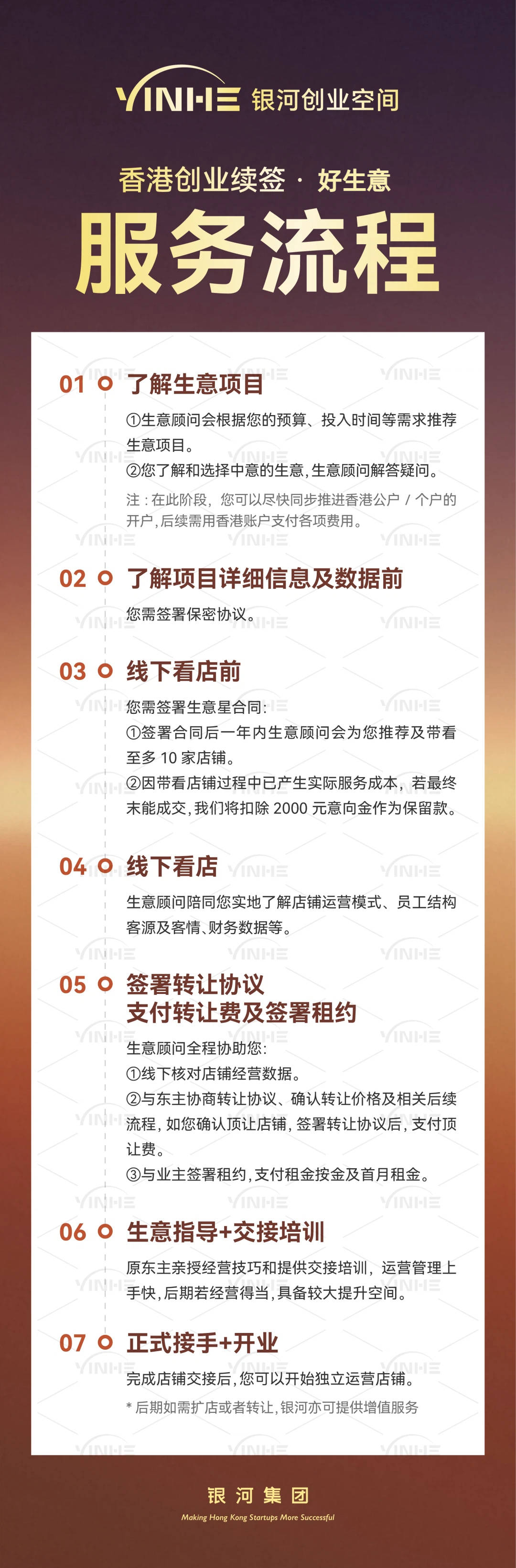 在香港创业、做生意每一步都需要规划,银河集团为您提供一站式香港创业服务,包括公司注册、银行开户、商业计划书、共享工位、生意顶让、代运营等创业续签服务,更有身份规划、续签拿永居等在港生活服务,更多细节了解,记得找银河Ruby(19065101539/18681542289),为您量身定制适合您的香港创业服务方案!