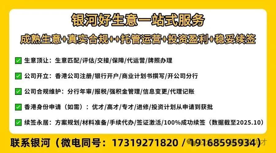 针对此种续签方式感兴趣的人士,可考虑银河集团的好生意服务,提供生意顶让、公司开立、年度商务服务、代运营、香港身份续签永居全包服务,按照港府要求实现真实自雇续签,联系获得一对一续签指导(17319271820)