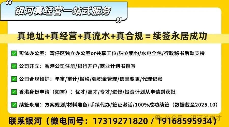 根据港府新政,续签永居必须真实在港定居、创业或就业。如您有续签或创业需求,银河可提供一站式咨询规划,自己省事省心、实现真实续签。欢迎联系银河君(微-电:17319271820/19168595934)了解服务详情: