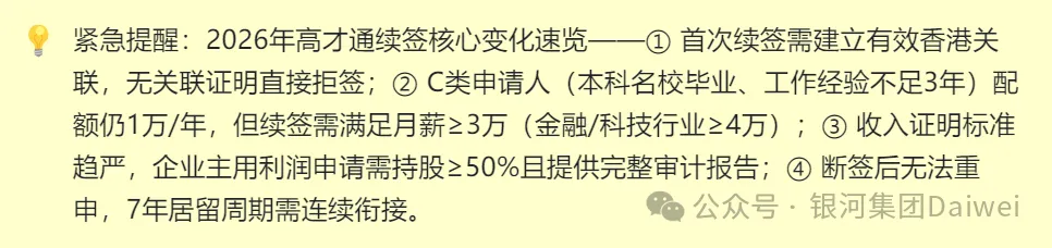 香港高才通计划分为A、B、C三类,2026年新规对三类申请人的续签要求进行了统一细化,核心围绕“真实在港发展”设置门槛,以下是必须掌握的4个关键变化: