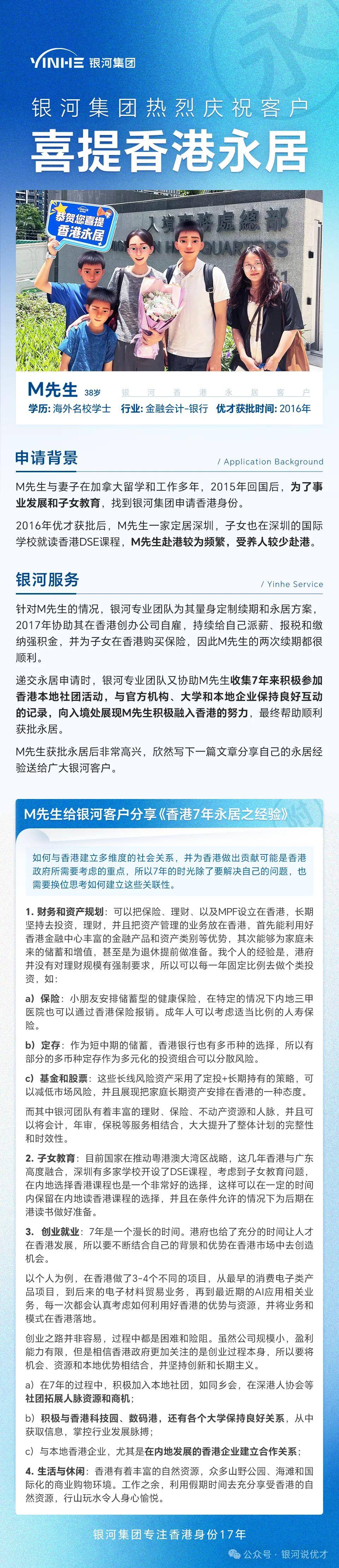 咱们银河集团就有不少香港开公司创业续签的永居案例,比如下面这位M先生,银河集团为其规划了7年的续签方案,最终协助M先生全家拿到了香港永居身份!