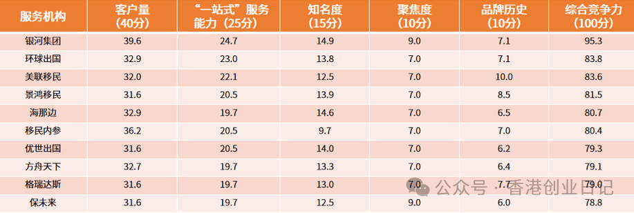 该榜单从客户量(权重40%)、“一站式”服务能力(权重25%)、知名度(权重15%)、聚焦度(权重10%)、品牌历史(权重10%)5个维度,对中国香港身份规划服务机构进行评比与打分,最后汇总得出总分。