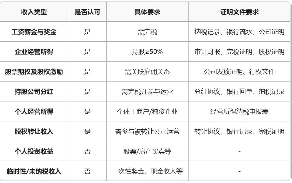 所有收入需提供官方完税证明(如个人所得税记录、企业所得税申报表等),临时补税或未申报收入无效。