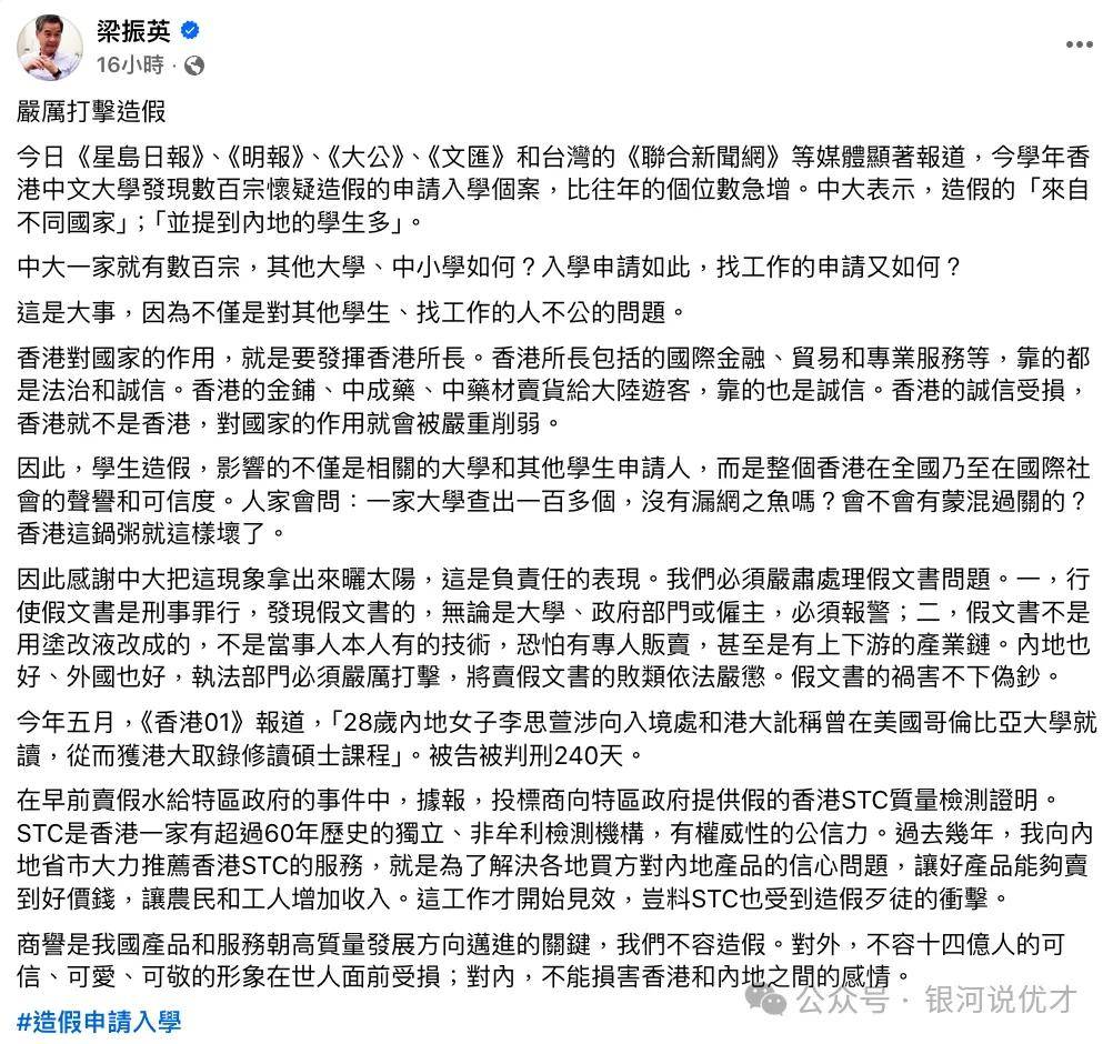 近日,全国政协副主席、香港前特首梁振英,发文怒批“学生造假”:“恐怕有上下游产业链,要将卖假文书的败类依法严惩。”