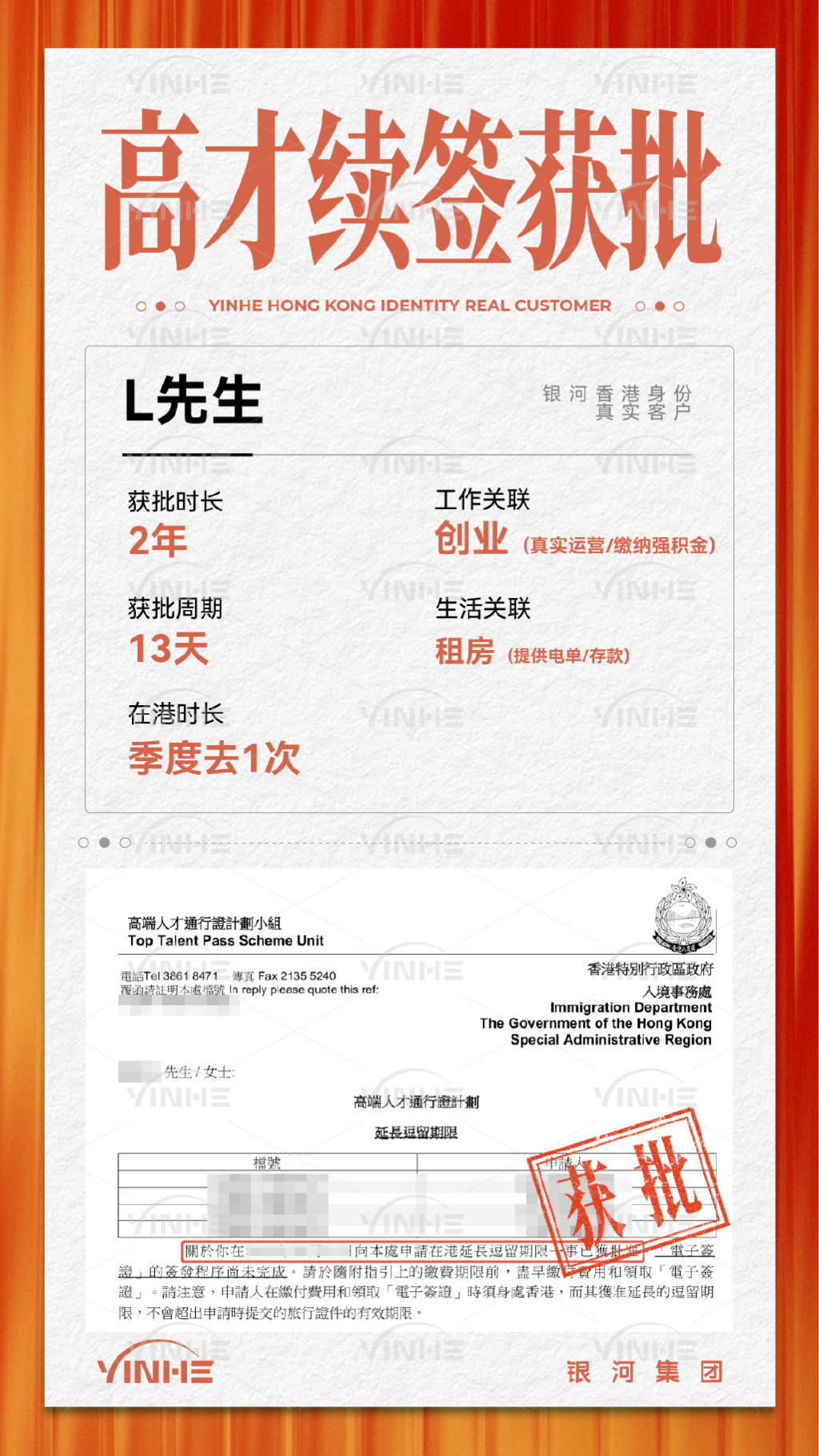L先生在港真实经营业务,并且有为自己缴纳强积金,同时在香港租房,能够提供电单,但与香港的“通常性居住”联系较少,平均每个季度去一次香港,但是逗留时间较短,银河集团续签服务团队针对L先生在港创业情况,详细帮助梳理材料,并陈述其商业发展计划,最终帮助L先生成功续签2年。
