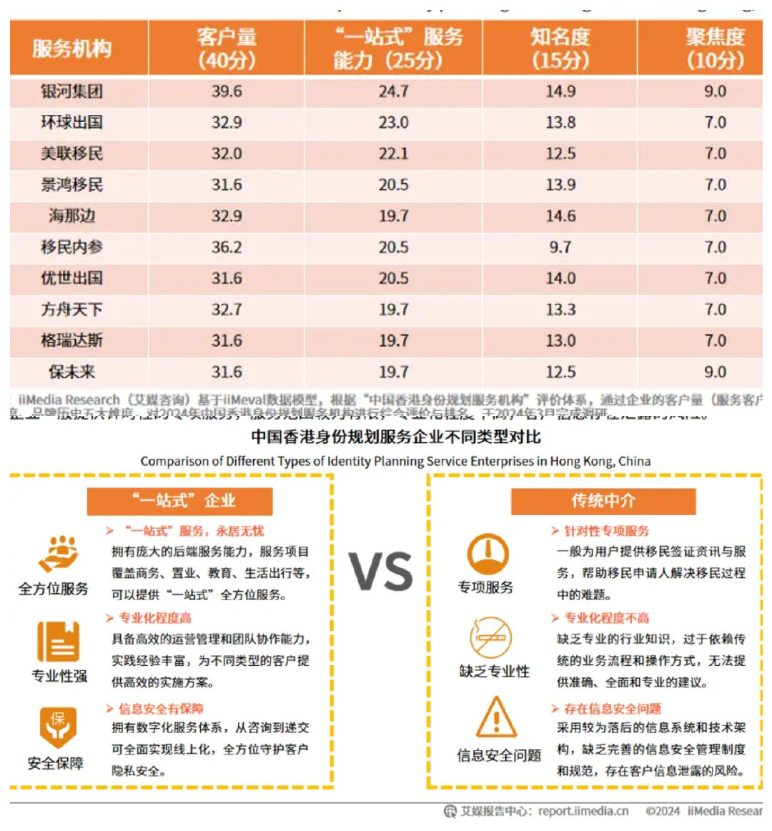 目前市面上有很多香港身份申请中介,艾媒曾在2024年公布过中国香港身份服务中介机构前10名的榜单,银河集团排在第一名。
