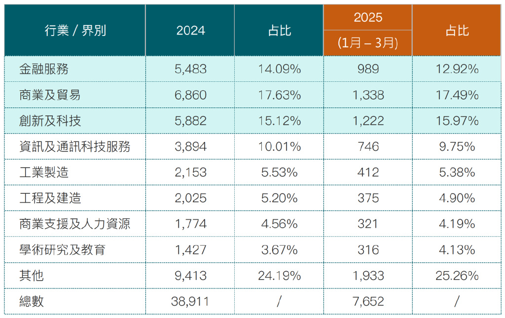 自2023年3月至2025年6月底,共有26,211名获批申请人申报其过往工作经历与创新科技相关。2024年获批者中,创新及科技领域占15.12%。