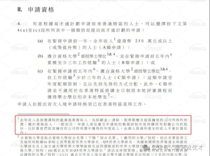 ①申请核心门槛:无需学历背景、语言能力证明或提前获聘,仅需满足 “紧接申请前一年全年收入达港币 250 万元或以上(或等值外币)” 即可申请。需要注意的是,针对企业主申请高才通A类,收入标准有所变化,下面会具体讲述。