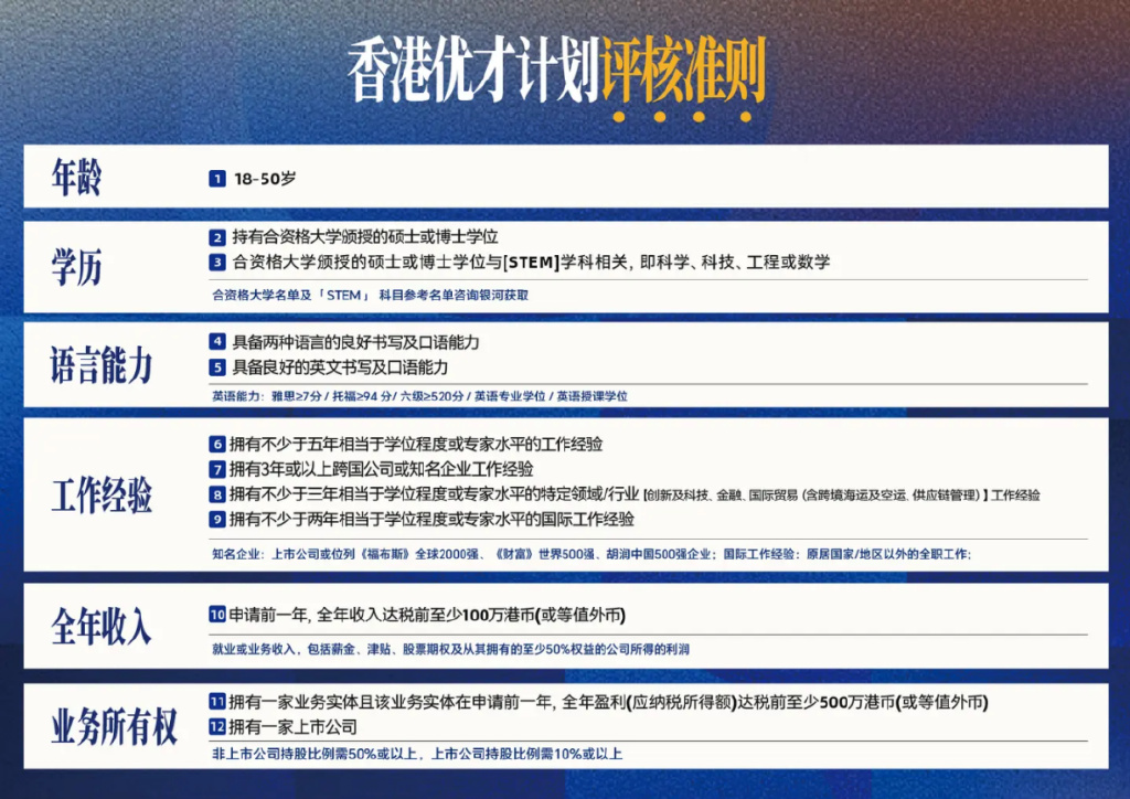 核心加分项:年收入≥100万港元、企业盈利≥500万港元、STEM专业硕博学历、3年以上名企或紧缺行业经验(金融/科技/物流)。