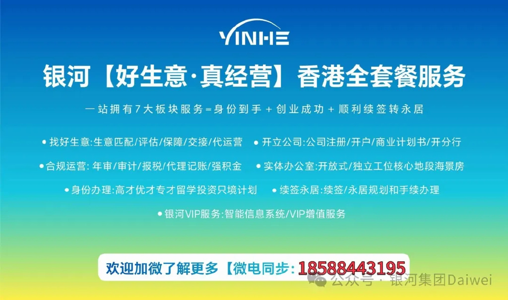 大家好,我是银河集团的Daiwei,全国移居中介排行榜TOP1,办理香港身份、创业及续签,认准银河集团。服务涵盖身份办理、项目筛选、店铺收购、办公室租赁,及后期招聘、商务运营管理等,续签与永居手续全包办。选银河,就是选专业懂香港、创业、续签的长期伙伴!银河【好生意·真经营】项目,助您身份、创业、续签转永居一路顺畅。详询银河Daiwei:18588443195 / 18588447901