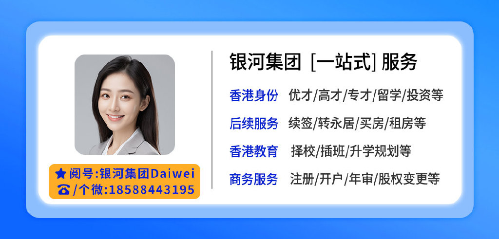 银河集团业务涵盖:香港身份申请、续签转永居,香港创业、就业咨询、房产、港宝教育等全方位、一站式的服务体系,确保申请人从申请到赴港后的身份续签永居及生活/创业得到妥善安排与保障。有需求请直接滴滴银河集团的Daiwei,享受专属的1v1咨询服务:电话/个微同V:18588443195;18588447901