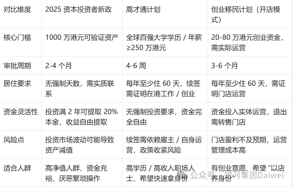 投资者最关心的问题是 “新政是否值得选择”,需结合自身条件与需求,对比香港主流人才计划的核心差异: