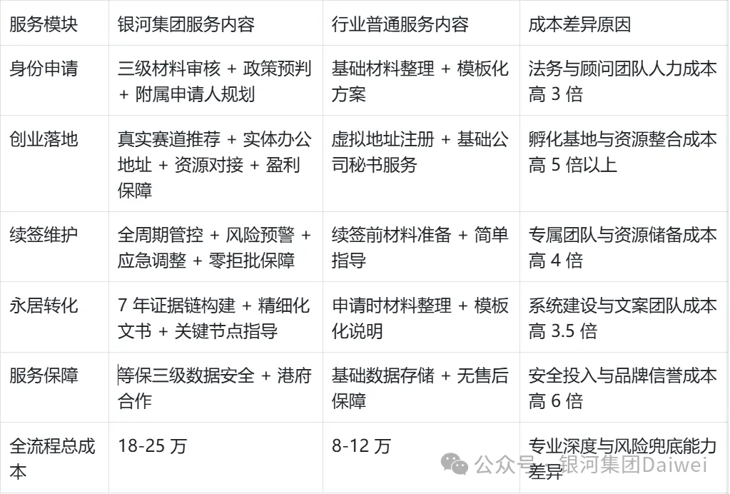 将银河服务与行业普通服务进行成本拆解,可清晰看到价格差异的本质(以 “高才通 A 类 + 创业续签 + 永居转化” 全流程为例):