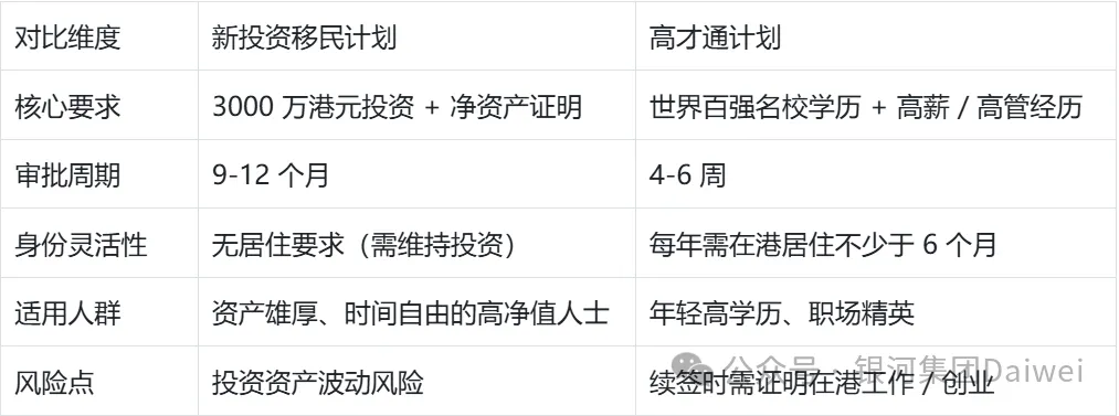 与香港高才通、优才计划等人才类政策相比,新投资移民计划有明确的适用边界,申请人需结合自身情况理性选择。