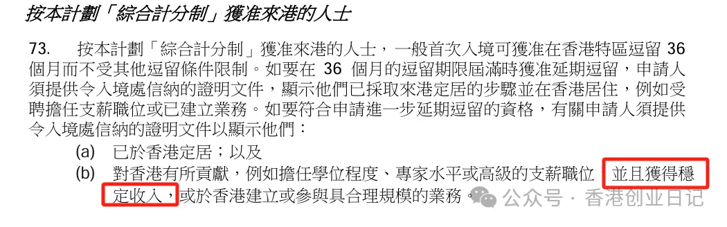 根据香港入境处公布的最新申请指南,香港优才计划最新续签条件有两个: ①已于香港定居; ②对香港有所贡献,例如担任学士学位程度、专家水平或高级的支薪职位,并获得稳定收入,或于香港建立或参与具合理规模的业务。 对此,有不少朋友就感到疑惑,这个稳定收入是不是意味着要求香港工作了呢? 在这里先告诉大家,增加了收入要求,并不意味着所有申请人都必须在香港有工作。 这个是指,如果申请人选择通过在港就业的方式来申请续签,那么这份工作要有稳定收入,不能是简单的“挂靠”。 入境处也会要求你提供雇佣合约、薪金支付通知书、银行通知书或存单以及由雇主开具的职务说明文件等材料,以证明其在香港有稳定的工作和收入。