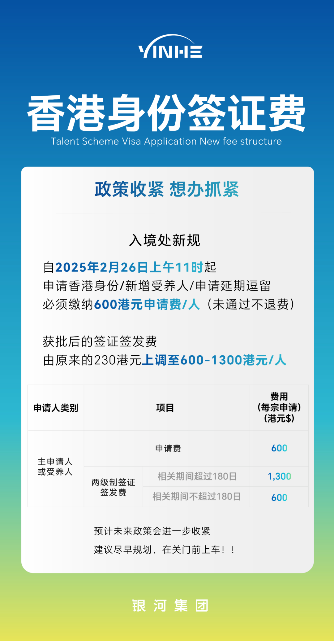 ①费用结构性上涨:申请费600港币/人(不退)+ 签证费600-1300港币(按停留时长分档),较旧政涨幅超200%。
