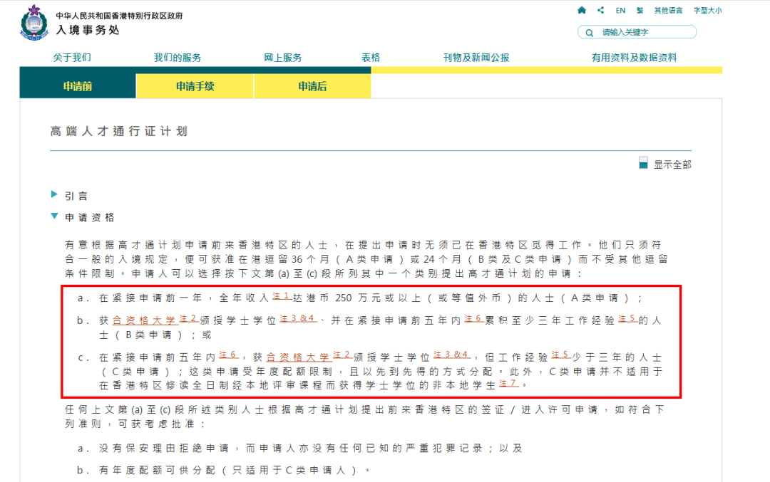 2025年香港高才通计划延续分类申请条件,核心调整集中在A类收入认定标准与B/C类院校名单扩容,整体政策导向更强调人才的“实际贡献”与“真实联系”。以下为三类申请条件的详细说明: