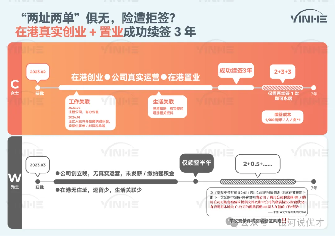 但是,其中隐藏的信息不得不看: 1、并非全部续签获批3年。 入境处助理处长翁荣桢直言:“3年是最长期限,非必然结果。审批会综合考量雇佣关系真实性、薪资市场水平、留港意愿等。” 也就是说,有人可能会获得3年、2年、1年、甚至几个月的续签! 回看入境处官网,高才通去年年底有在续签详情页的描述做了对应更新——申请人一般最多续签3年,或者到雇佣合约到期,以较短者为准。 而对于在香港创业或参与业务的申请人,具体能续签多久,会考虑营业额在内的多个因素。 比如下面这个案例,同样是在港自雇续签,但是因为续签规划、材料、做法等不同,导致批出的续签时长也不同。 如果想要续签3年高才通身份,务必做好在港工作+逗留+贡献等方面的规划!具体怎么做?
