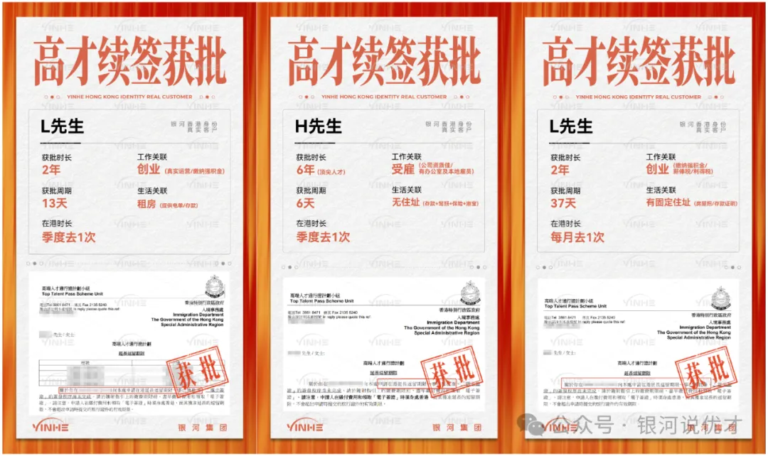 结合银河高才通获批案例来看,不同续签年限有不同的特点,大家可以了解下: 高才 1 年续签特征: ①在港逗留少+有工作(创业有运营受雇)+无住址; 高才 2 年续签特征: ②在港逗留一般+有工作(公司资质较好)+无住址; ③在港逗留少+有工作(公司资质较好)+有住址; 高才 3 年续签特征: ④长期在港+有工作(公司资质较好)+无住址; ⑤长期在港+有工作(公司一般)+有住址; ⑥在港逗留一般+有工作(上市公司)+无住址。 根据港府新政,续签永居必须真实在港定居、创业或就业。如您有续签或创业需求,银河可提供一站式咨询规划,自己省事省心、实现真实续签。欢迎联系银河君(电话/微信:17319271820)了解服务详情: 三、不常在香港、如何稳妥续签高才通? 事实上,有不少高才精英获批身份后,还经常在内地,跟香港的联系较少,这种情况下,是非常难续签的。 这也是不少高才获批者放弃了续签的主要原因。 不过,并非没有方法。 对于不能常在香港、想自由来往两地、想要稳妥续签的人士,则更适合香港创业自雇续签(在香港开公司或开店铺做生意)。 既能掌握主动权、也能顺利续签。 香港创业续签的两种方式 1. 在香港开公司 在香港注册公司并开展业务是常见的创业续签方式。具体步骤包括: 注册香港公司 租赁办公场所 业务开展 招聘员工 合规运营公司并持续发展业务 续签 如果您有现成业务,可考虑去香港开公司自雇。 银河集团【真经营】提供香港公司开立、工位租赁、年度商务服务、身份续签永居全包办服务,按照港府要求实现真实自雇续签,至今100%成功续签,欢迎联系获得一对一续签指导(17319271820) 真经营服务内容参考如下: 2. 在香港开店或收购店铺 开店或收购现有店铺是另一种创业续签方式,适合希望快速启动生意的申请者。具体步骤包括: 筛选心仪店铺并探店 了解店铺详情 收购店铺 直接接手经营 续签 如果您没有意向业务,还不知道如何做,可考虑去香港直接收购一家店铺做生意,更为简便。 银河集团【好生意】提供生意顶让、公司开立、年度商务服务、代运营、香港身份续签永居全包服务,按照港府要求实现真实自雇续签,至今100%成功续签,欢迎联系获得一对一续签指导(17319271820) 银河好生意服务内容参考如下: 四、高才通续签避坑指南 1、把控申请时间与地点 需在逗留期限到期前 3 个月内提交申请,且提交时申请人必须身处香港,否则无法完成网上续签程序。建议提前规划行程,避免因身处境外错过申请时机。 2、保证证件与离港合规 港澳通行证剩余有效期需至少预留 3.5 年,曾有申请人因证件有效期不足,原本可获批 3 年的续签被缩短至 10 个月。若单次离港超 6 个月,务必准备书面解释及证明材料,比如外派函、医疗诊断书等,此前就有申请人因离港 210 天且无合理解释被直接拒签。 香港身份续签时长一般有1-6年,如果您想知道自己能一次性续签几年,不妨测评了解自己的续签结果: https://www.galaxyoversea.com/renewal/1?pla=yes-gw-yinhe&spreadword=202512162 3、配合核查流程 入境处可能会采取文件核验加实地突击检查的方式审核。需提前告知员工配合核查,办公场地要始终保持正常运营状态,避免突查时出现无人办公、无业务痕迹的情况,否则会影响 3 年续签的审批。 4、强化在港关联的加分操作 入境处 2025 年续签新政增加了在港居留关联性的考核,可通过留存相关凭证提升 3 年获批概率。 所以,为了顺利拿到香港永居身份,还是需要跟香港多来往,生活方面,可保留有效期≥12 个月的租房合同及连续水电网缴费记录,还有子女在港就读证明、家庭香港医疗保险参保记录等;社会融入方面,参与本地义工活动、行业协会活动时,保存好活动照片、参与证书等,这些都能成为续签加分项。 5、材料齐全且真实有效 续签材料需完整、清晰,如工资单需加盖公司公章,银行存款证明需满足金额要求。 避免提交虚假材料,一旦发现将直接拒签,并可能影响未来申请。 6、提前规划续签 入境处审核续签时,看的是你在前面2年在港工作和生活情况,你在香港居住时间越长、工作越久、跟香港连续越多,越容易获得3年续签。 如果你临近续签才开始去香港,入境处只会给你批短期续签。 建议在首次获批后即开始规划续签,尽早建立与香港的工作联系。 7、寻求专业中介协助续签永居 香港高才通从申请到永居整个流程是比较长的,环节较为复杂,续签则更为严格,中途出错只能重头再来。 因此,更建议精英们找专业中介一站式服务,这样自己省事省心,还能提高拿到永居身份的成功率,毕竟我们是奔着永居来的,如何性价比更高拿到身份,才是我们需要看重的。 众多香港身份中介中,银河集团凭借多年的经验和优质服务,成为众多赴港中产精英的首选。 银河集团提供真实经营、合法合规的创业自雇续签服务,可根据您的实际情况制定续签方案,如有兴趣欢迎联系获得一对一续签指导(微or电:19168595934 / 17319271820): 五、高才通续签材料准备 香港高才通获批后,如果想要顺利完成续签,申请人除了满足续签条件外,还需要提供对应的佐证材料,高才通续签证明材料简单概括有以下几类: 1、个人身份证明材料 2、受雇证明材料(自己开公司雇佣自己也需要提供) 3、收入证明材料 4、纳税证明材料 5、公司证明材料 6、留港时间证明材料 其实香港入境处已经详细列出了续签需要提供的材料清单,准备材料的