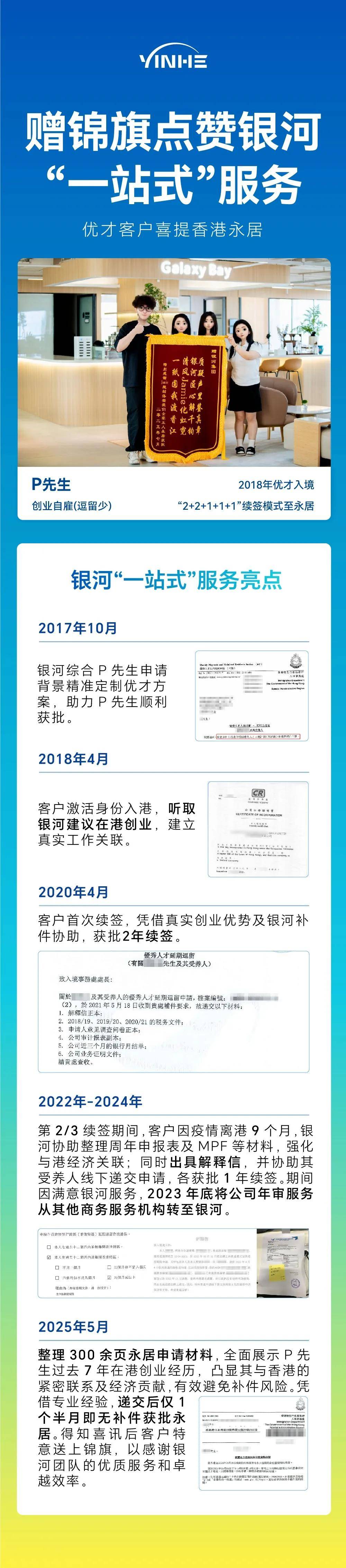 整理300余页永居申请材料,全面展示P先生过去7年在港创业经历,凸显其与香港的紧密联系及经济贡献,有效避免补件风险。凭借专业经验,递交后仅1个半月即无补件获批永居。得知喜讯后客户特意送上锦旗,以感谢银河团队的优质服务和卓越效率。