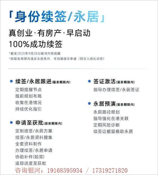 银河提供2-7年(可选服务时长)的续签/永居跟进(定期提醒节点、提前规划布局等)、签证激活、材料准备、永居预演等服务,全流程跟进,银河至今100%成功续签(数据截至2025年10月)
