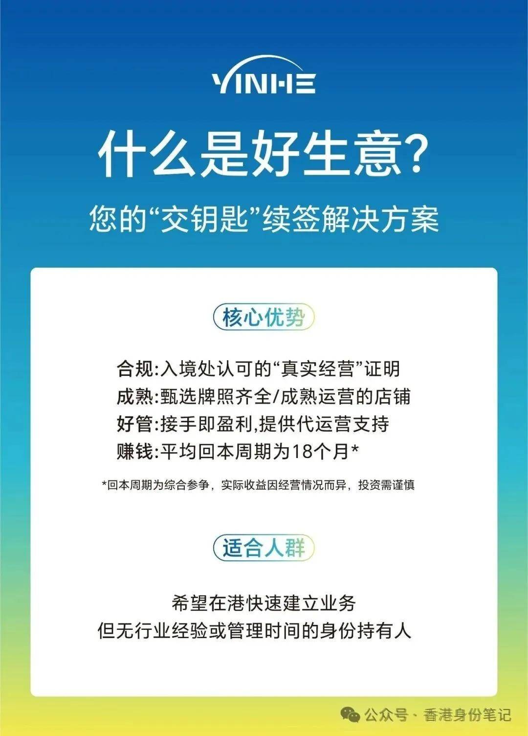 银河集团【好生意】提供生意顶让、公司开立、年度商务服务、代运营、香港身份续签永居全包服务,按照港府要求实现真实自雇续签,至今100%成功续签,找银河获得一对一续签指导(17319271820)