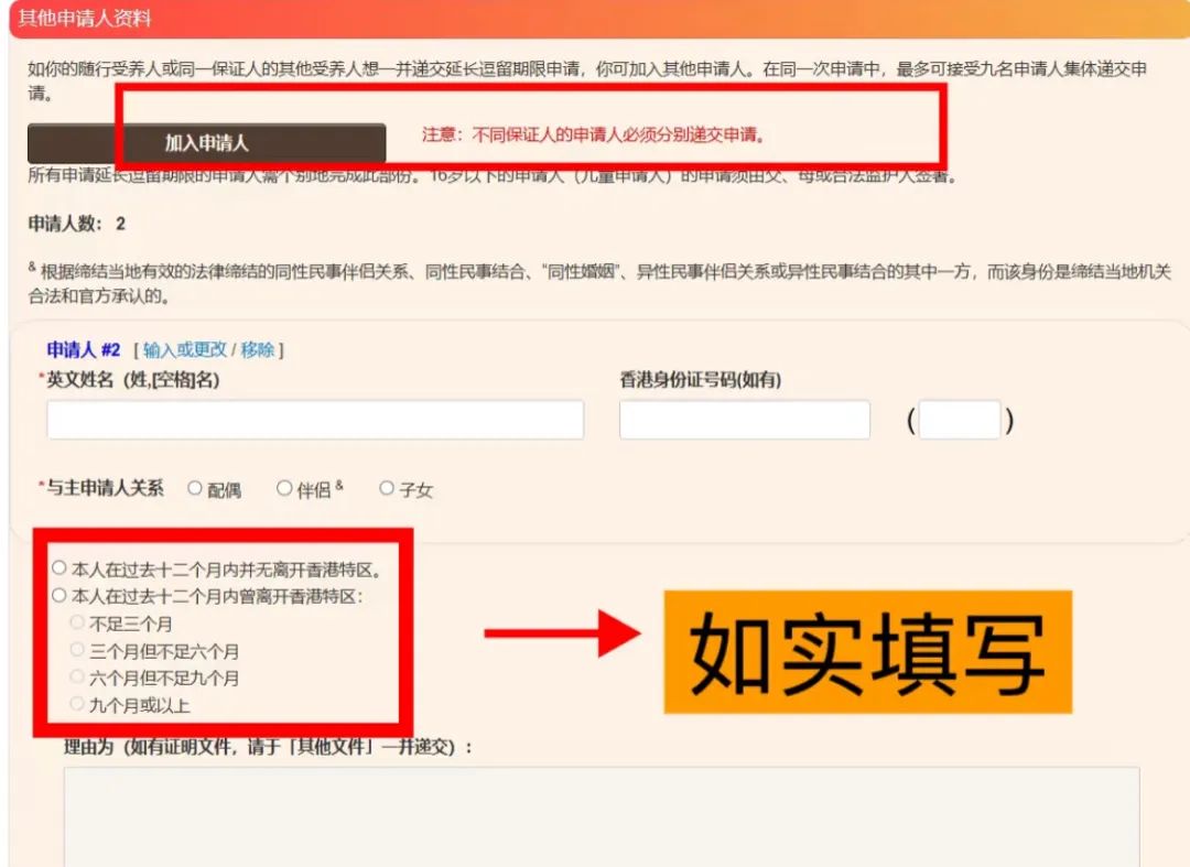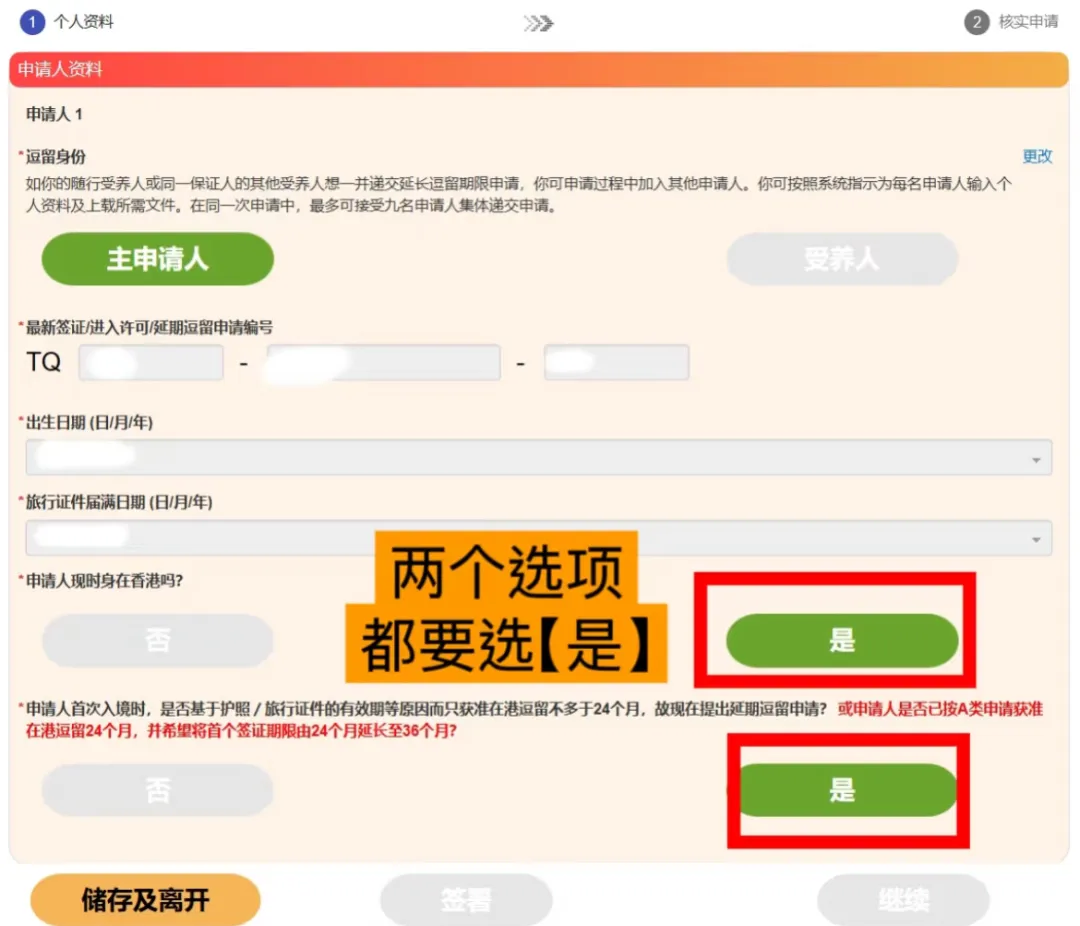 进入高才续签入口后,会看到相关选项,需要注意的是,请务必先前往香港填写相关信息,入境处要求申请人和受养人在港。