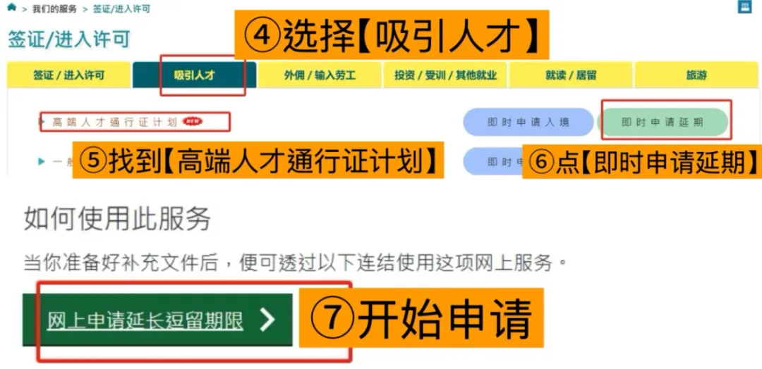 找到香港入境处后,按照步骤找到高才通申请续签的入口【网申申请延长逗留期限】,点击进去。