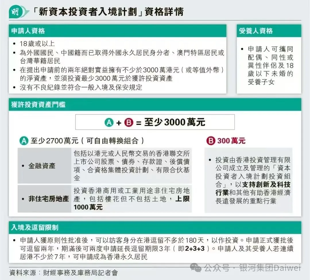 对于全球高净值人群而言,这不仅是获取香港永居身份的黄金窗口期,更是通过资本配置实现财富增值、税务优化、教育医疗资源升级的战略机遇。银河Daiwei将从政策核心、投资架构、实操流程、风险对冲四大维度,深度解析2025年香港投资移民新政的实操指南。