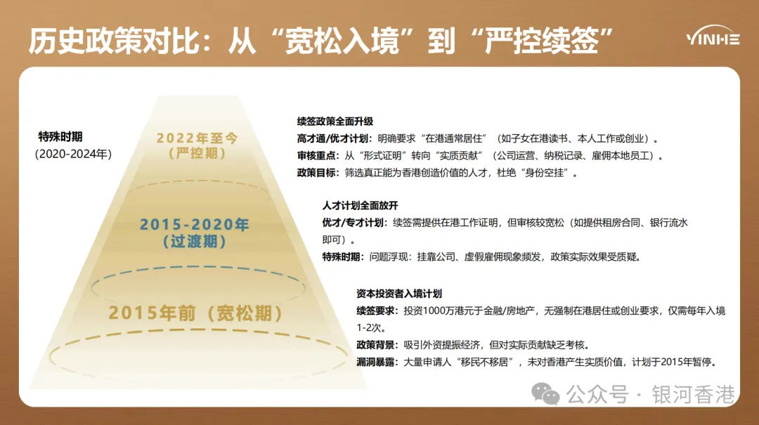 这并不能说明香港身份续签难度低,实际上从香港人才历史政策可以看出,港府对于人才的安排已经从“宽松入境”到“严控续签”的演变。