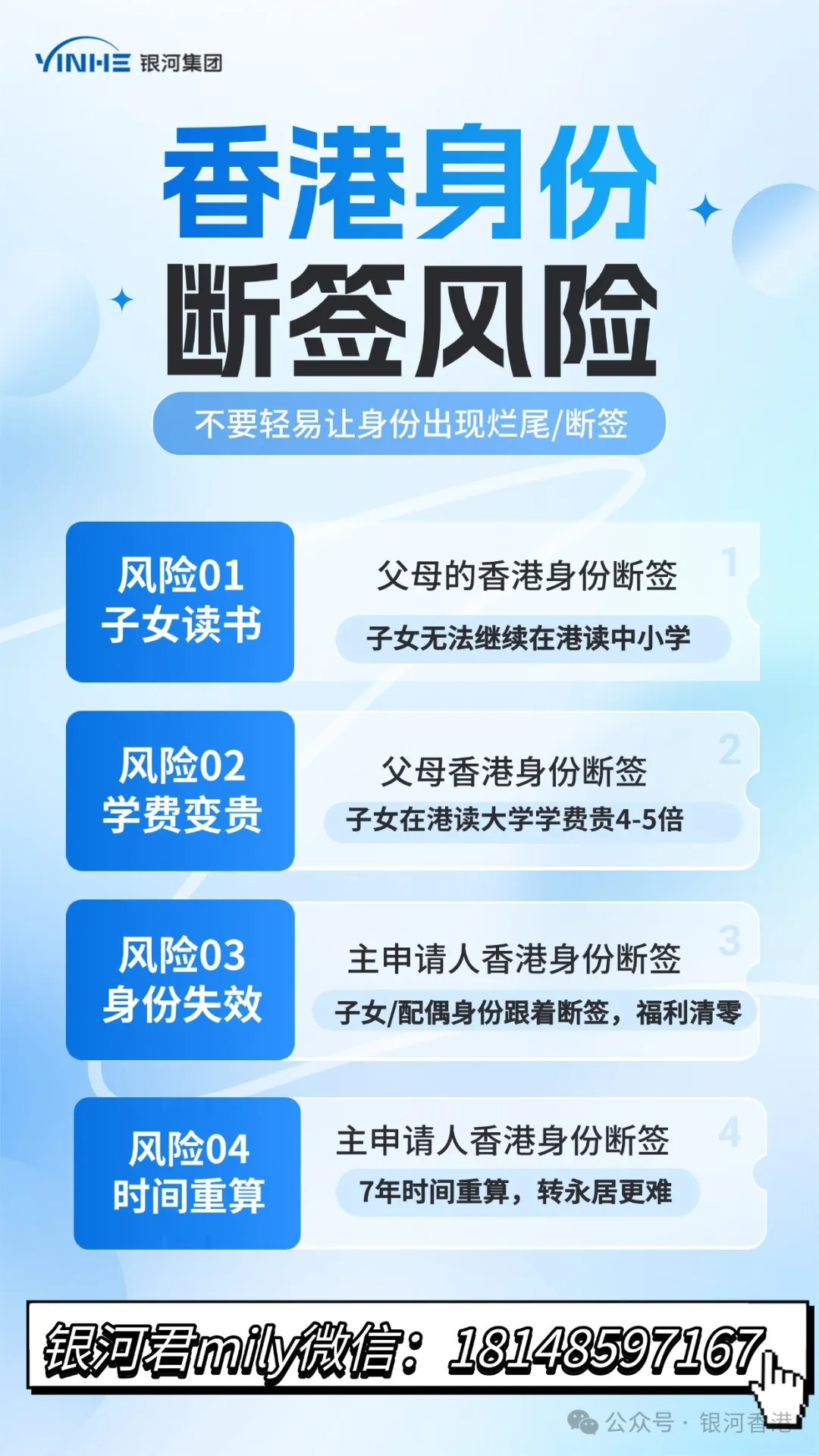 大家好!我是银河君mily,银河集团提供香港身份申请、续签、永居、创业续签、中小学插班、购房、投资入境、公司注册等服务,有兴趣随时滴滴我咨询(微信and电话:18512604364、18148597167 )
