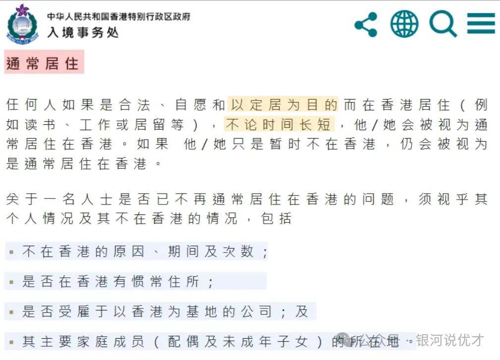 通常居住:需证明以香港为主要生活中心,有定居计划或能为香港做出经济贡献