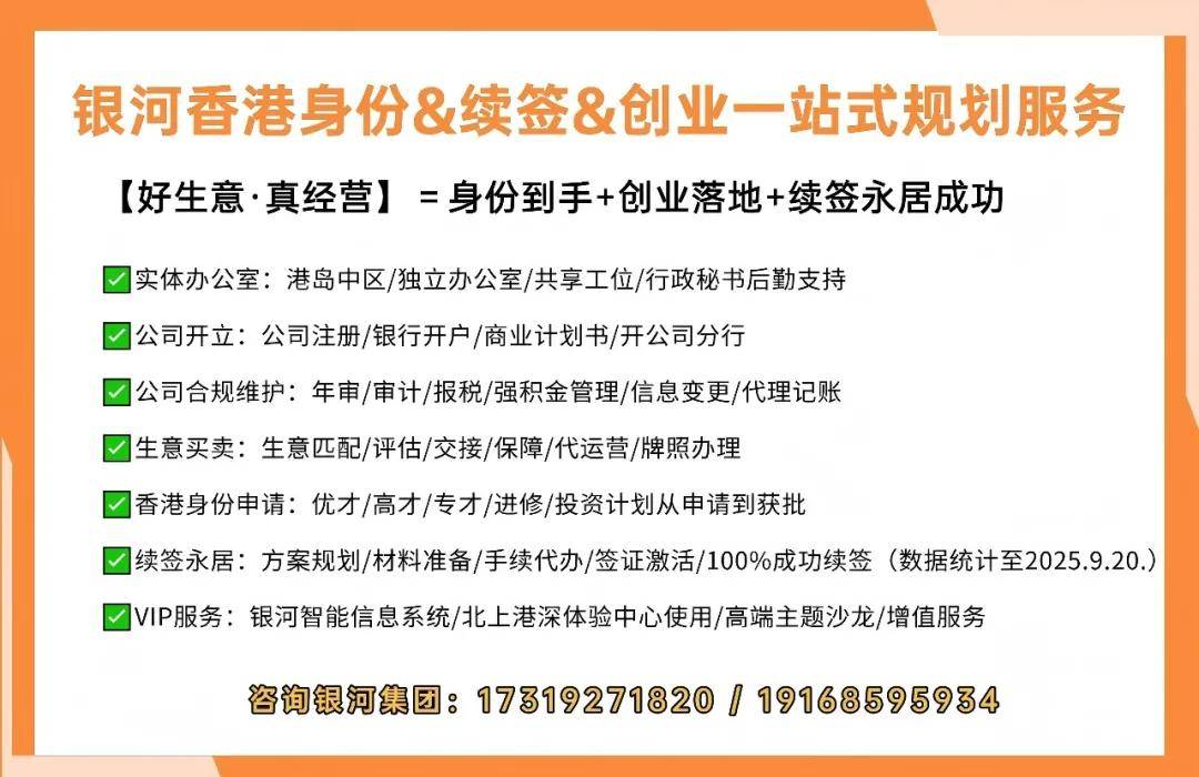 银河集团深耕香港身份服务十余年,有着100%成功续签纪录(数据截至2025年10月)、行业第一的综合实力,提供从续签规划、政策解读、材料梳理、文书撰写、合规运营、永居整合的一站式闭环服务,助你牢牢掌控身份主动权,稳妥衔接续签与永居。联系银河免费了解详情(电/微:17319271820/19168595934)