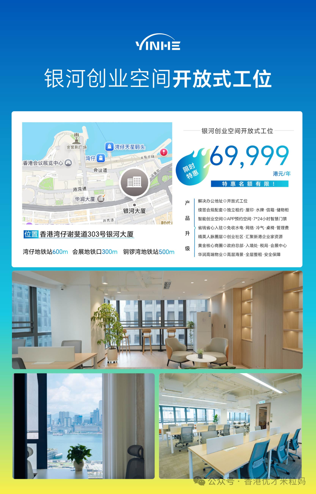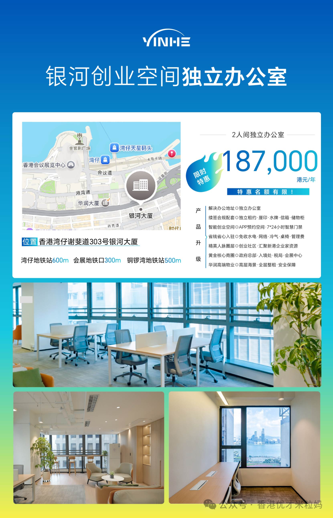 两类办公空间均包含核心配套费用:水电、冷气、高速网络、物业管理费、独立电子水牌、专属收信地址、厘印文件办理等基础运营成本,无需额外支付其他杂费,较香港中环、湾仔等核心区传统写字楼成本降低40%-60%。 如果你想要详细了解,欢迎随时DD银河米粒妈(18565851853 &17675416895)
