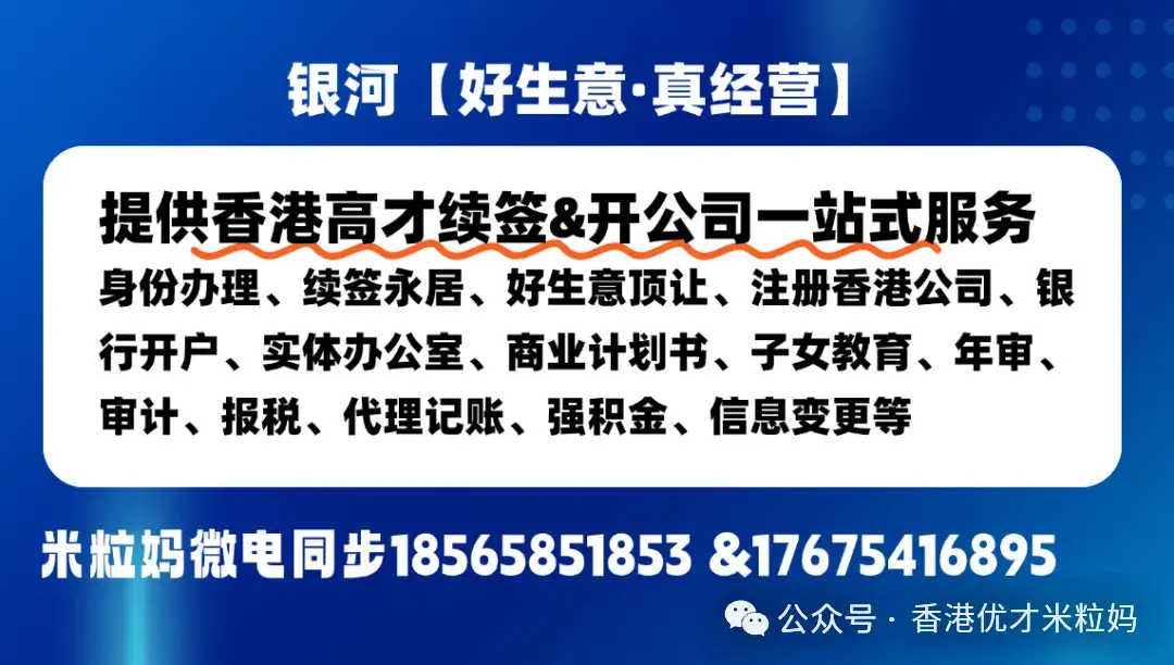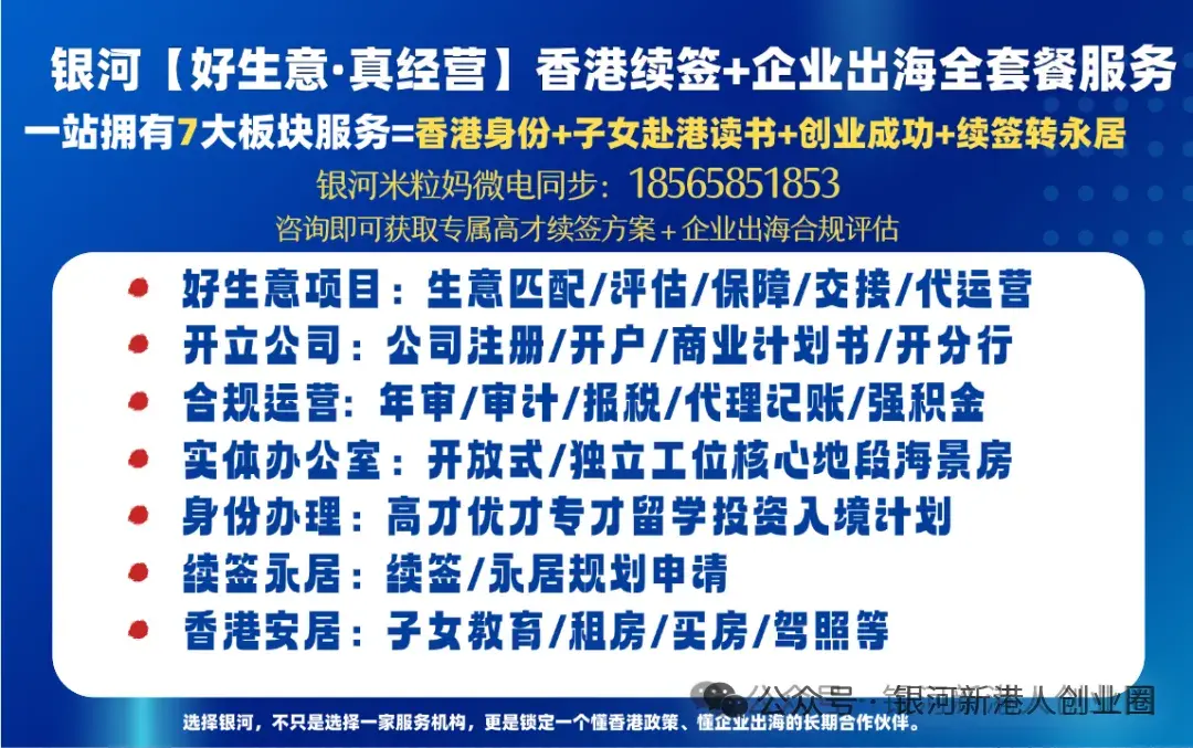 银河集团购买银河【好生意·真经营】服务,你将拥有银河7大板块服务,助您拿到香港身份、子女赴港读书、创业盈利、顺利续签转永居。银河专注香港业务十几年,被艾媒评为香港身份中介机构TOP1,拥有大量获批案例,续签拒批率为0。选择银河,不只是选择一家服务机构,更是锁定一个懂香港政策、续签和创业的长期合作伙伴。现在咨询,即可获取专属香港身份签方案 + 企业出海合规评估!如果你想要了解银河【好生意·真经营】可以加我微信详细了解(18565851853 &17675416895)