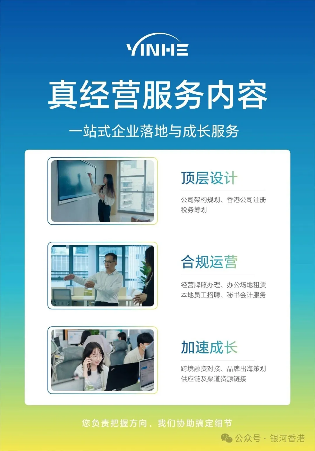银河的【真经营】产品,还为创业者提供一站式商务服务,包括香港公司注册、银行开户、公司年审、申报税务、强积金缴纳、代理记账等,让你全程无忧。