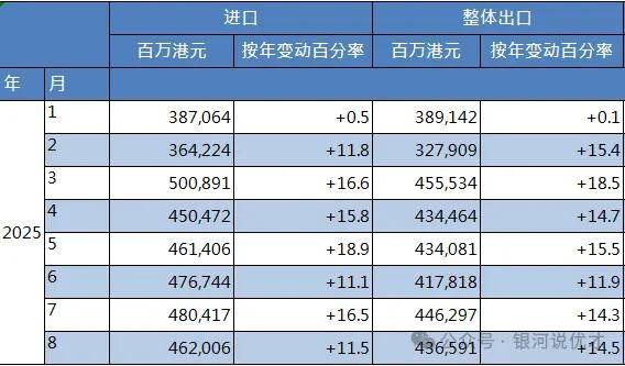 香港作为全球贸易中心,拥有世界一流的港口物流体系和零关税政策,2025年香港出口及进口货值已连续7个月高速增长,前8个月同比均增长13%。对东南亚出口增速尤为迅猛。