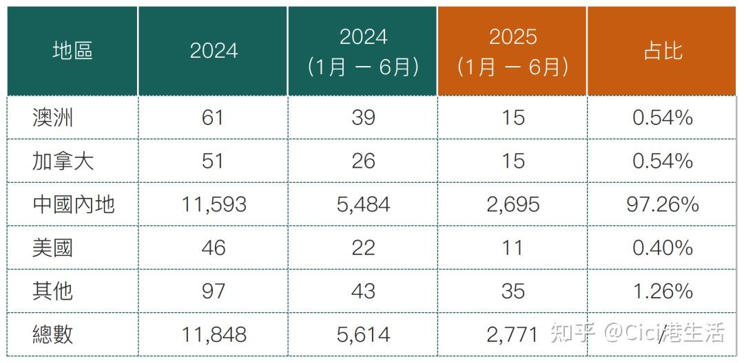 然而,进入2025年,获批数据已呈现回升趋势。第二季度单季获批数量较第一季度(891宗)实现翻倍增长。整个上半年的总获批量,也已达到2022年(全面取消名额限制前)全年批核总数的97.4%。从申请人背景来看,内地申请人仍占据绝对主体,比例高达约97%。