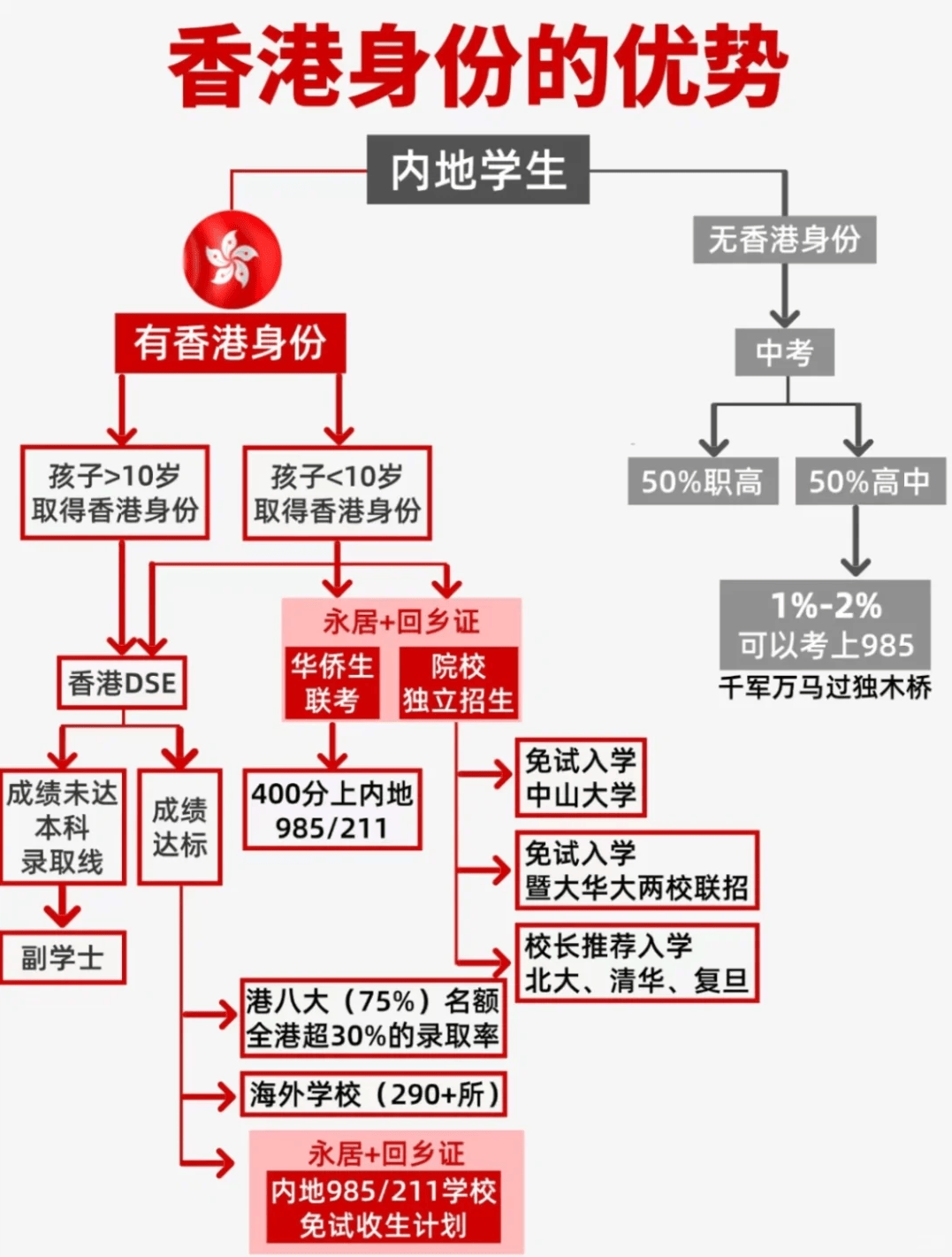 特别是子女教育方面:下面一图可以对比出来拥有香港身份的子女,能享受的教育资源是很大优势的: