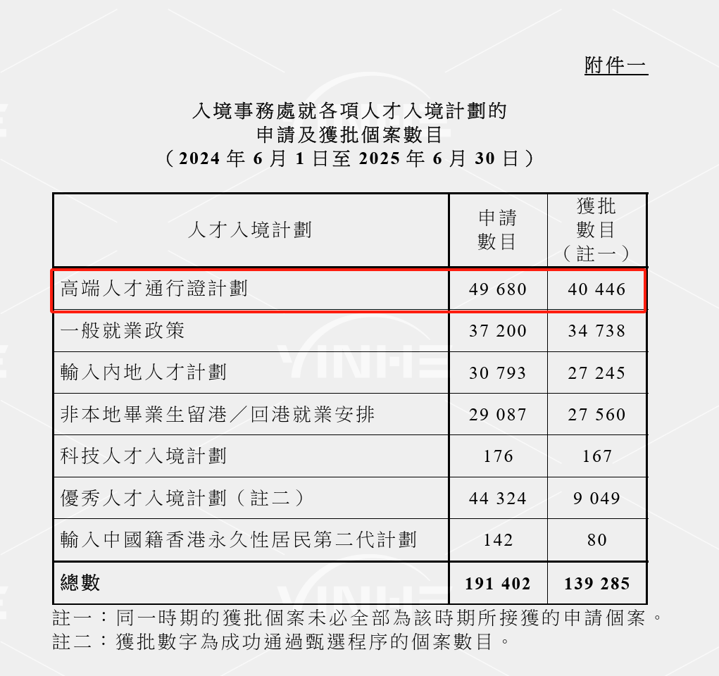 包括高才通、优才、一般就业政策、专才及IANG签证等——共收到约19万宗申请,其中获批个案为14万宗,整体获批率约为73.68%。