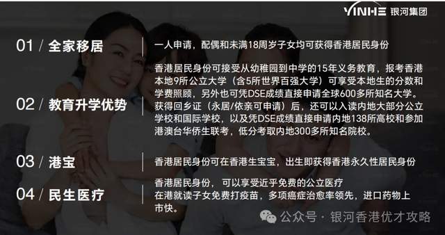 可携带家属共同赴港,申请人可为其配偶和未满18岁的未婚子女申请随行,这意味着一家人都可以获得香港身份,在港享受教育、医疗等优质资源;