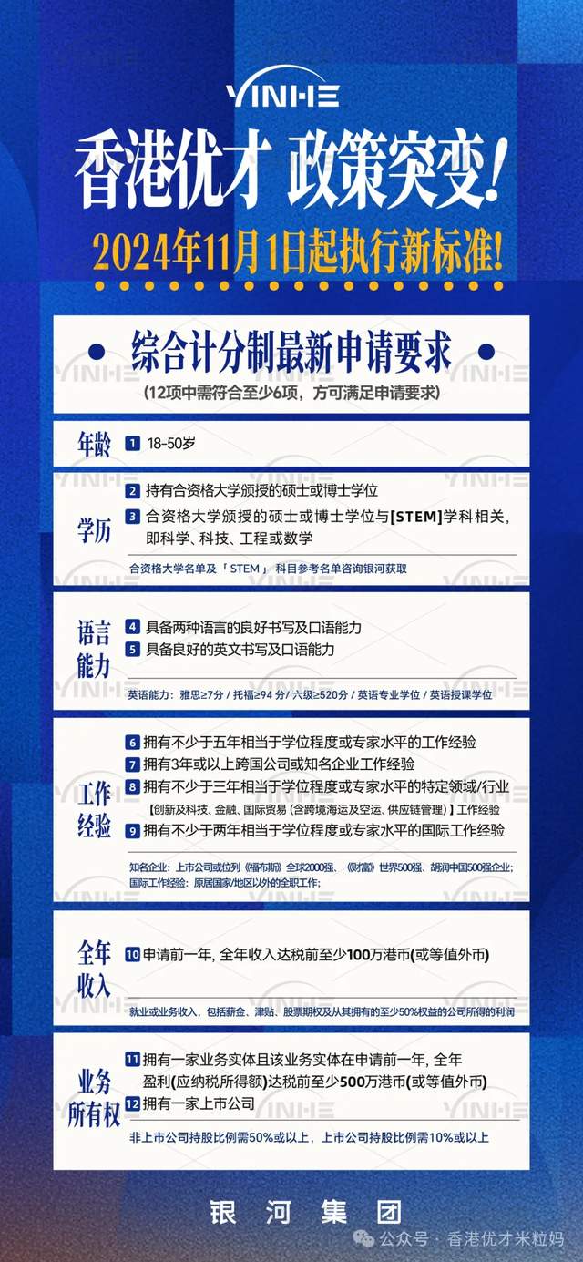 高才通B类新政策:2024年10月高才通B类计划扩容,全球仅有198所院校被香港入境处认定为“合资格大学”,其中内地有22所大学上榜,包括清华大学、北京大学、复旦大学、上海交通大学等著名学府。此计划仅针对本科毕业于这些名校的人才,硕士或博士学历不在此列。