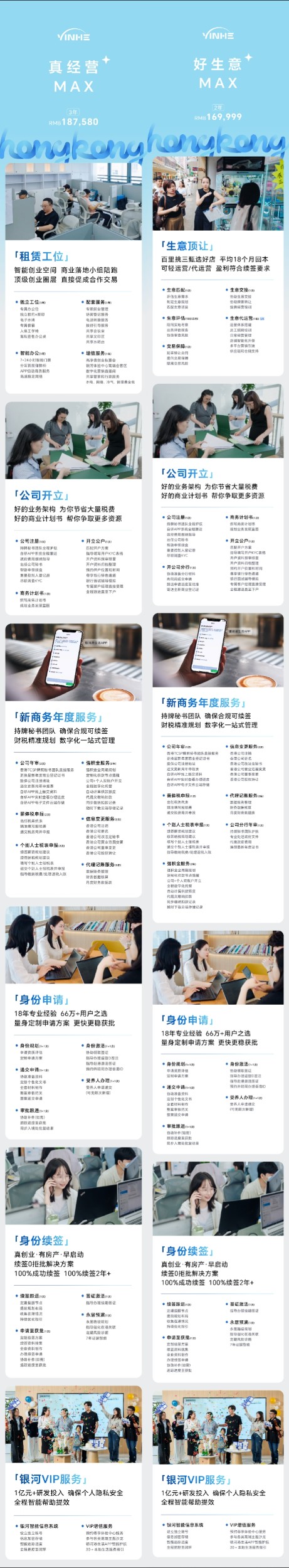 办公工位及独立办公空间租赁(水电网络一价全包+独立租约/水牌/厘印+共享行政/hr/管家服务等)、香港公司注册、银行开户、强积金服务、公司年审、代理记账、薪俸税申报等商务年度服务以及续签&永居跟进;
