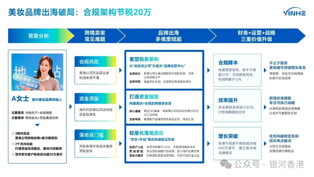 银河解决方案:重塑税务架构(从“收款壳公司”升级为“品牌运营中心”),将业务拆分香港公司主导品牌授权与国际贸易,内地公司承接生产,以及合规申报准备定价文档,合理规划两地税务情况