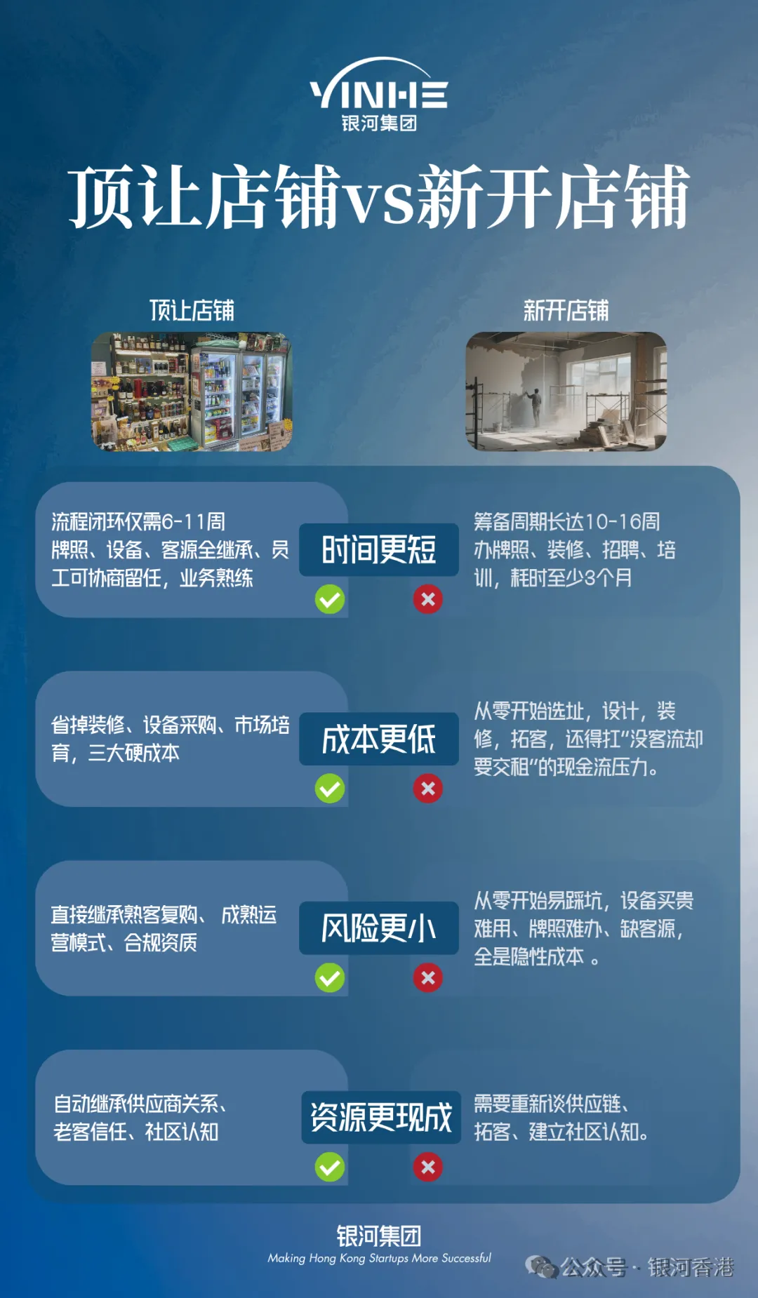 其实我们也可以看到在香港开一家餐饮店成本较高,前期也需要投入很大的精力,而且最终不一定能够顺利续签,所以我们银河集团会建议大家优先考虑不直接开店,而是找一家成熟店铺直接买下来,这样成本更低、风险更小也更快回本。