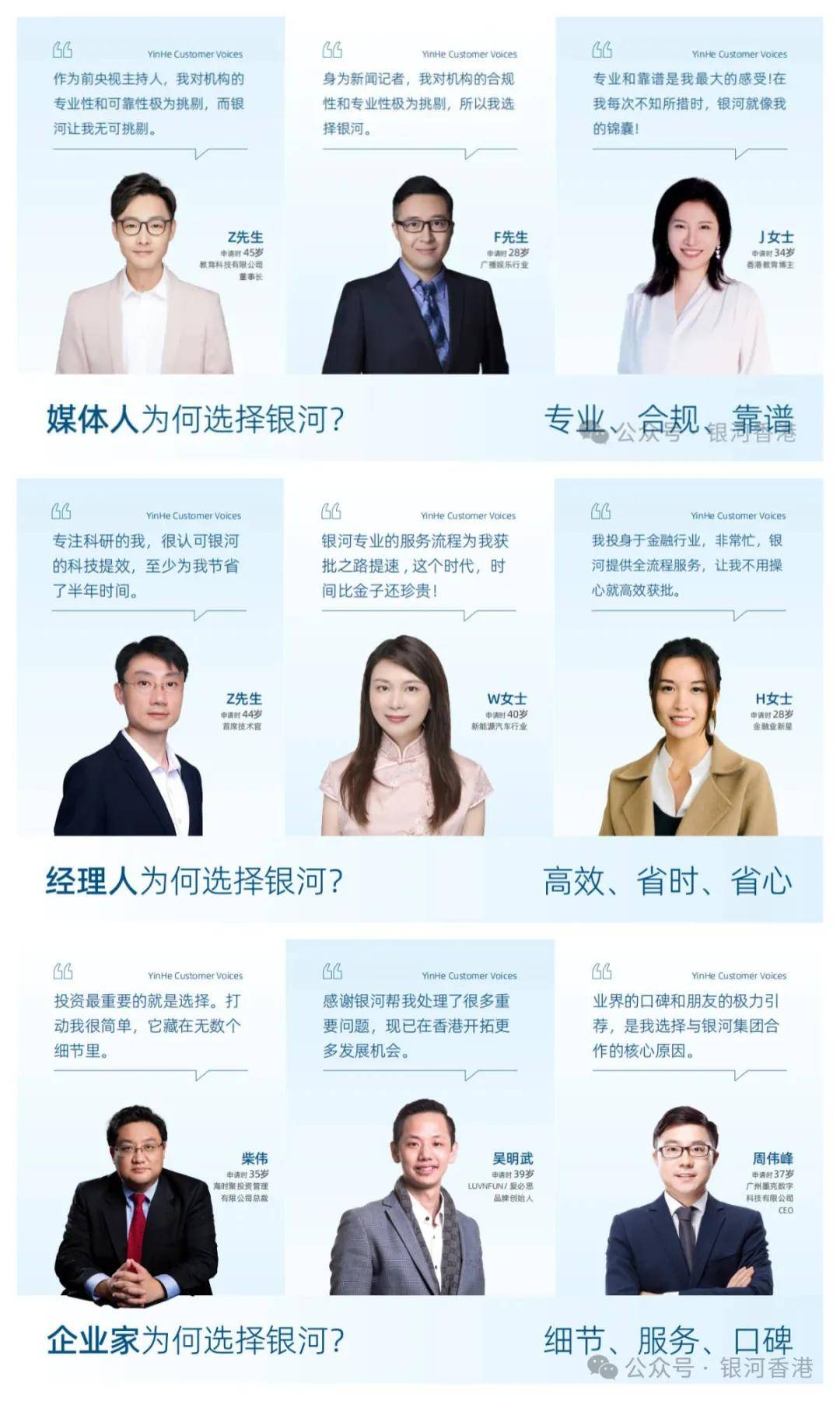 银河集团成立于2007年,是一家提供一站式香港身份服务规划和服务的科技创新型企业,总部位于深圳,目前已在北京、上海、香港建立分公司。聚焦香港身份17载,已服务客户60万+,不管是前期服务,还是后期交付,亦或是中间信息安全维护,银河都投入巨大的人力成本,逐渐赢得官方、市场和用户的认可